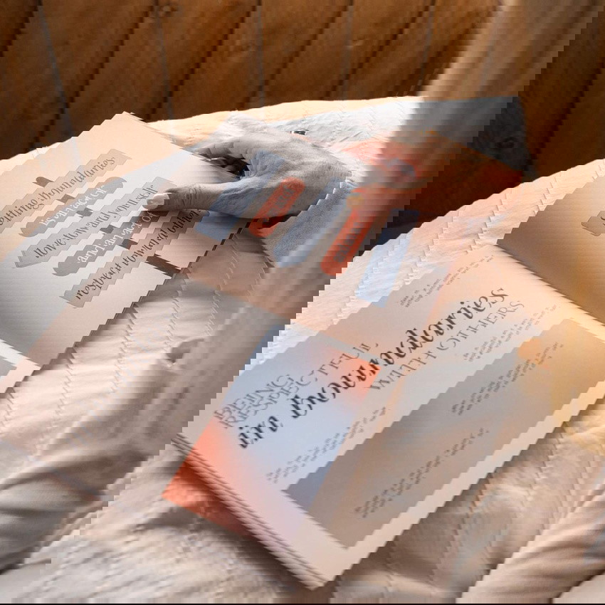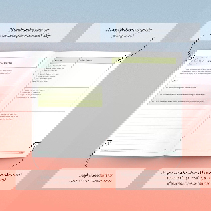 Empower yourself with The Boundaries Journal: A 30-day therapist-led guided journaling program, including video guidance and a beautiful softcover journal.