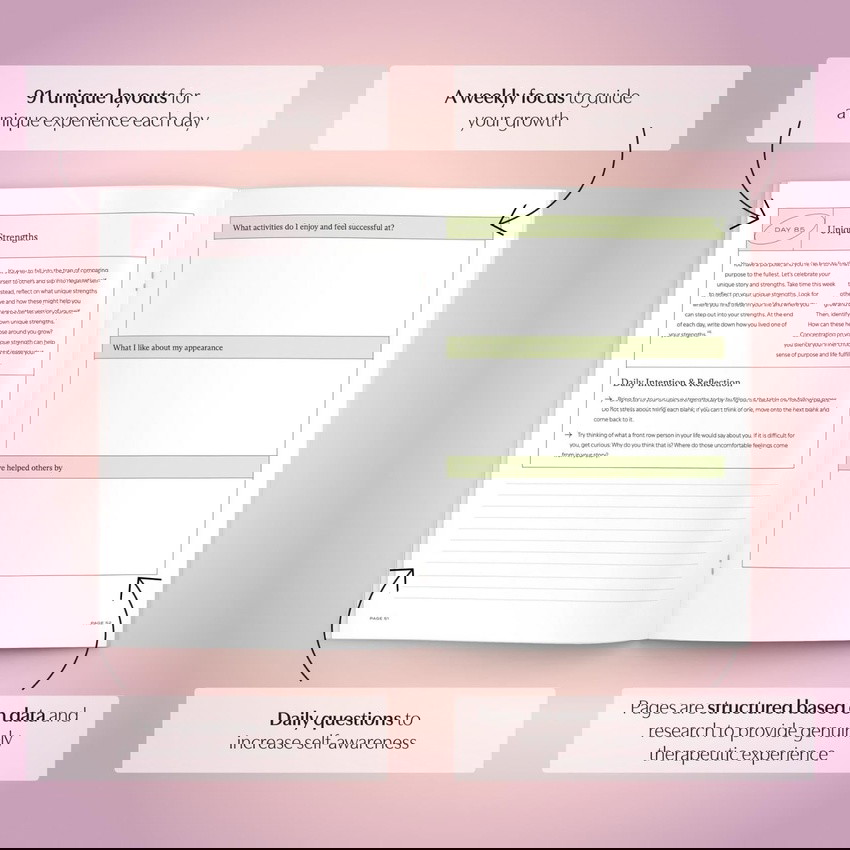 The Self-Talk Program is a comprehensive, step-by-step program that includes video guidance from a licensed therapist and 3 softcover journals. The program is divided into three parts: identifying your inner critic, challenging your inner critic, and replacing your inner critic.